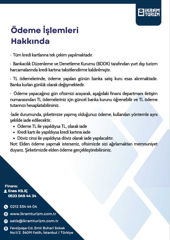 - ✔️ Not: Tur başlangıç tarihine 20 günden daha az bir süre kaldıysa tur ödemesinin tamamı tahsil edilmektedir.